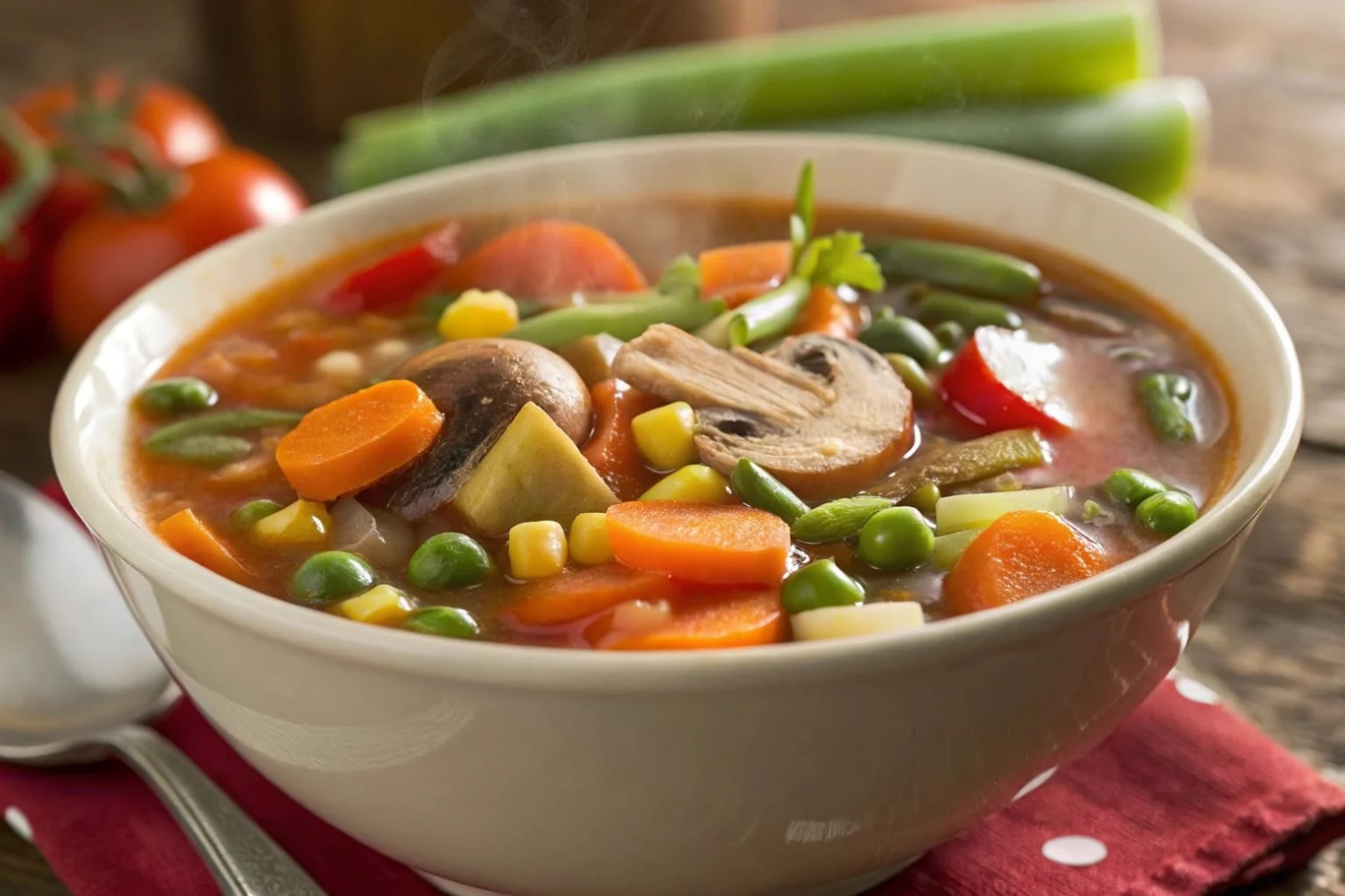 ভেজিটেবল স্যুপে থাকে বিভিন্ন ধরনের সবজি যেমন গাজর, ব্রকলি, বাঁধাকপি, মটর, টমেটো, পেঁয়াজ, রসুন ইত্যাদি। এগুলোতে ভরপুর থাকে ভিটামিন A, C, K, ফাইবার, অ্যান্টিঅক্সিডেন্ট, মিনারেলস, এবং ফোলেট — যা শরীরের রোগ প্রতিরোধ ক্ষমতা বৃদ্ধি করে।